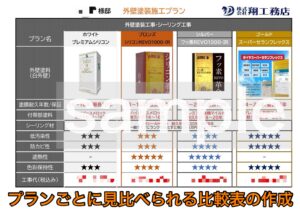 比較表については塗料のランクごとに分けさせて頂きまして、合計金額や耐久年数が一目で比較できるようになっております!