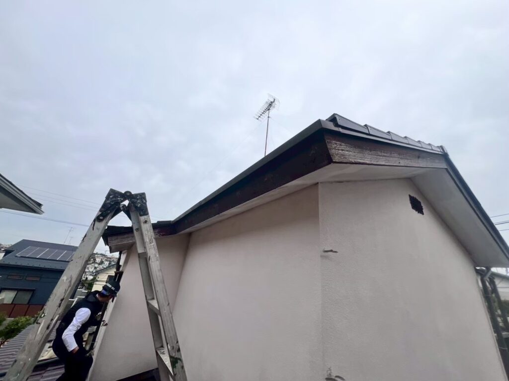 鼻隠しを傷つけないように、雨樋と金具を撤去していきます! 既存金具の解体後は、ビスや釘の穴が空いているため、補修も行います。