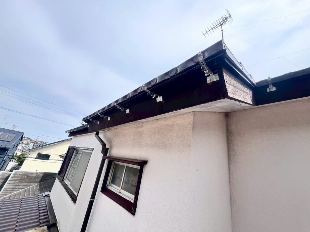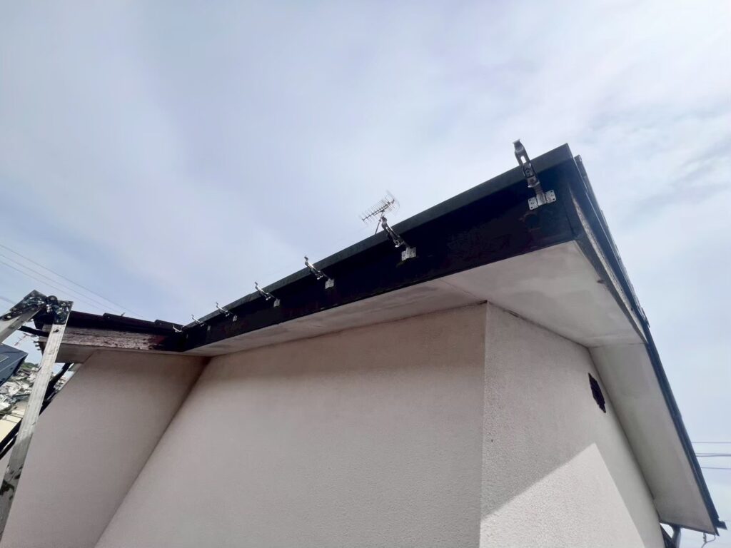 注意点は、鼻隠し(軒受け金具がついていた箇所)や建物の歪みにより金具で勾配をつけても逆流することがあります。水平器を鼻隠しに当てて勾配を確認してから金具をつけて行く事が重要です!