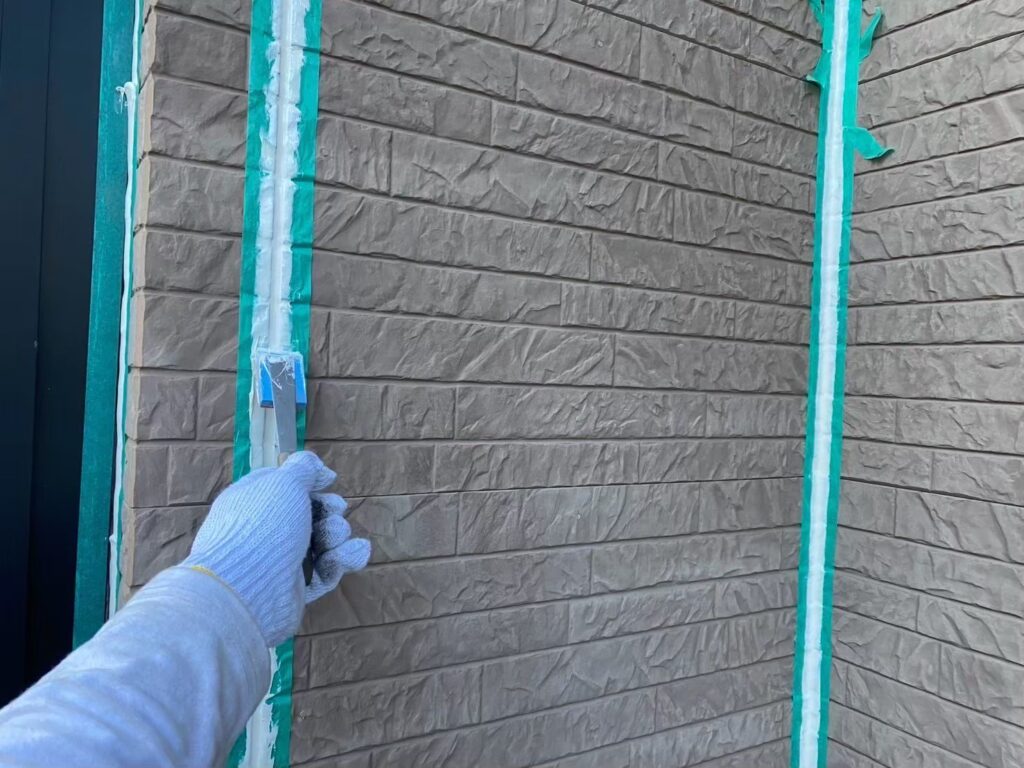 今回の工事で使用したコーキング材は、サンライズ/SRシールH100になります。耐久年数が約30年と超高耐久・超低汚染で、柔軟性があり、汚れがつきにくい材料になります。