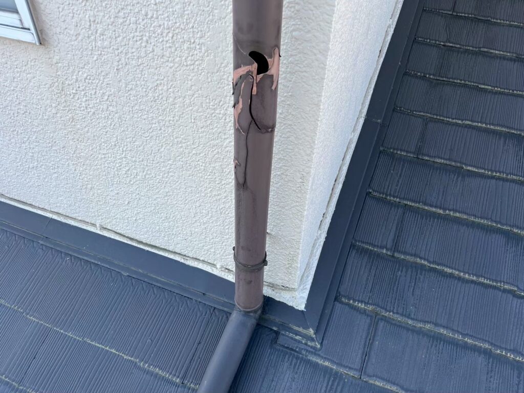 今回の施工内容は、割れてしまった縦樋の部分的な交換工事になります。