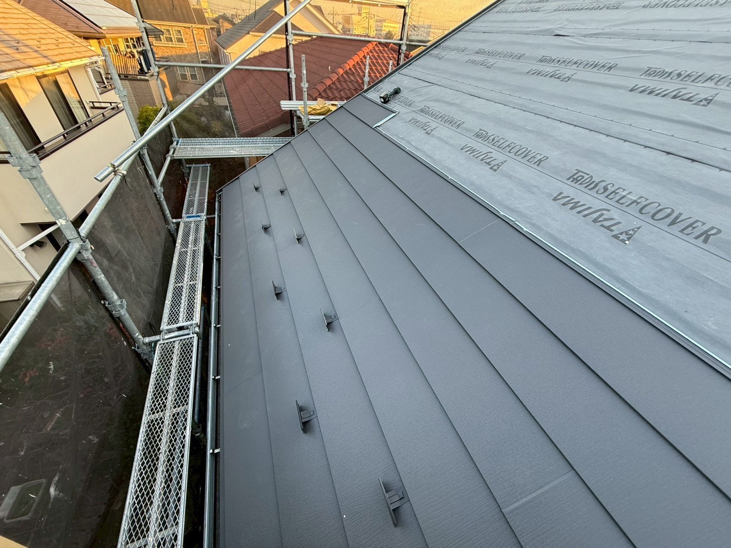 | 屋根材:アイジー工業/スーパーガルテクト(色・シェイドチャコール) ルーフィングシート:田島ルーフィング/タディスセルフカバー 貫板:ガルバリウム鋼板 シーリング材:オート化学工業/オートンイクシード |