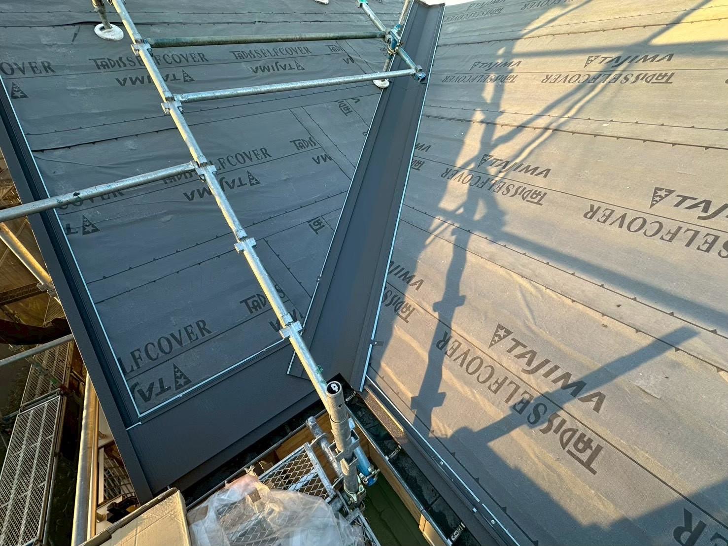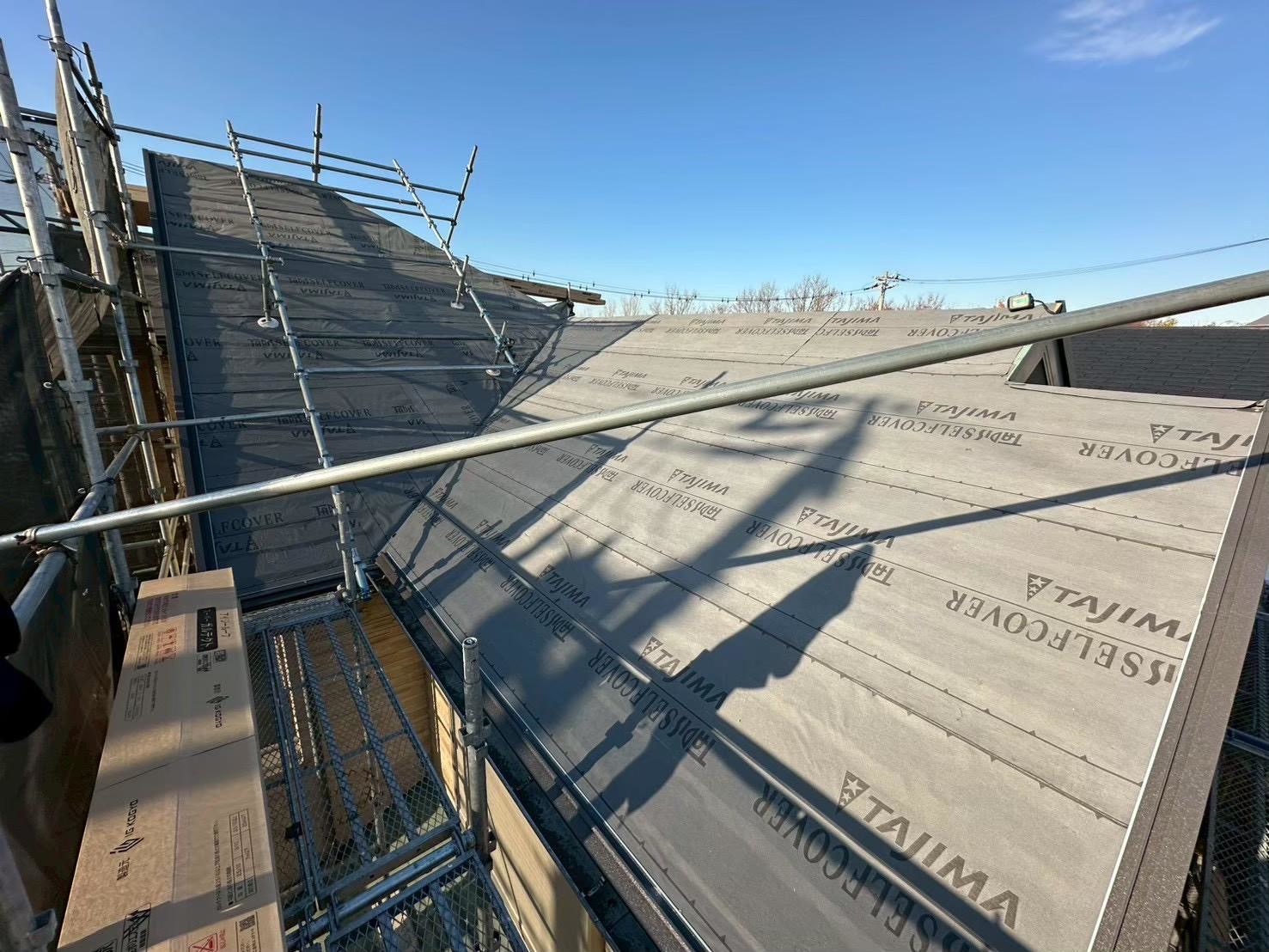 こちらを、風などで飛ばないようにしっかり貼っていきます。ルーフィングシートにも様々な耐久年数や特徴がある為、新規屋根材の耐久年数や屋根勾配にあったルーフィングシートを選ぶことが重要です!