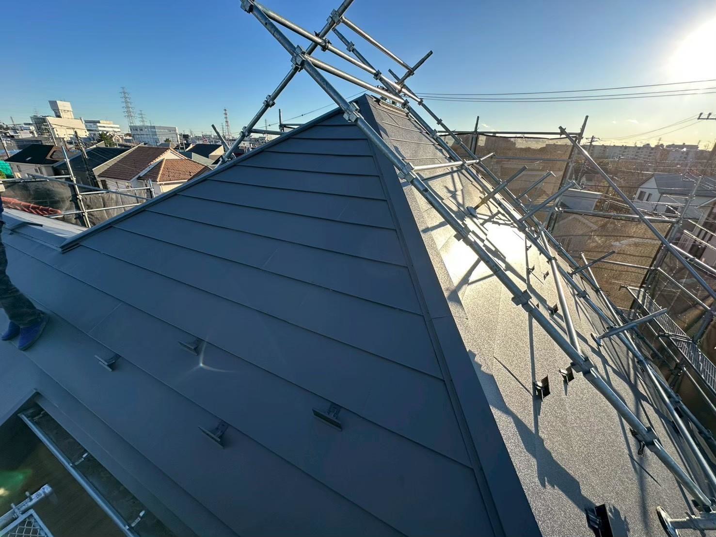 使用した屋根材はアイジー工業のスーパーガルテクトになります。スーパーガルテクトは塗膜15年、穴あき25年のメーカー保証が付き、弊社からも施工保証が10年付きます!