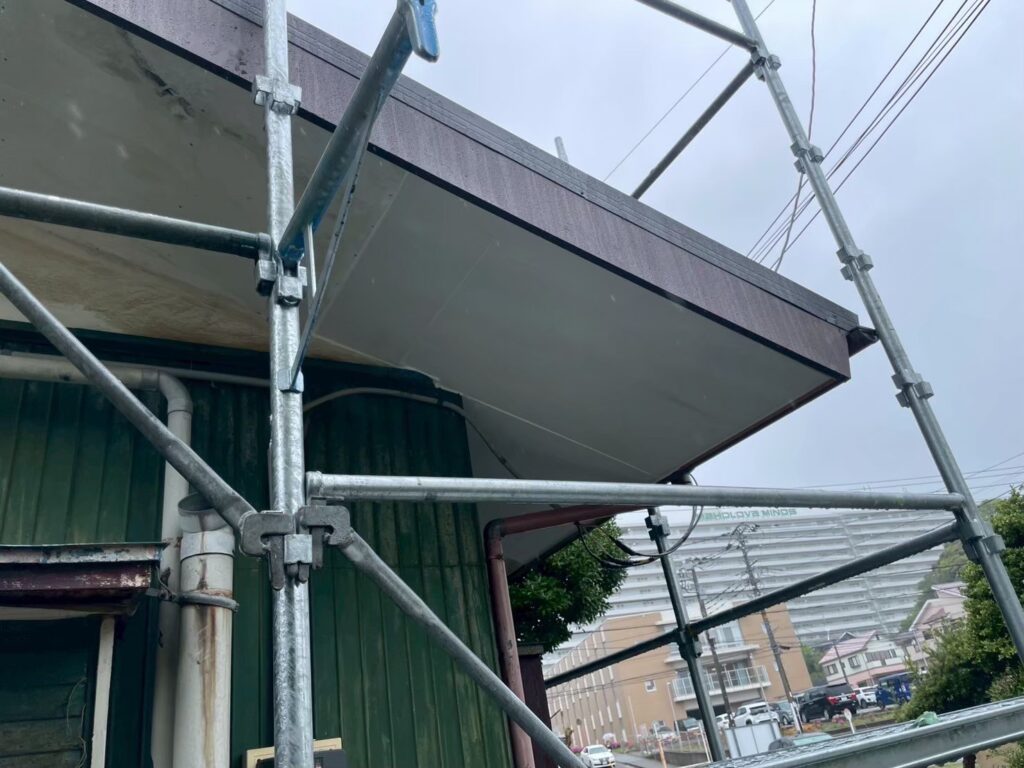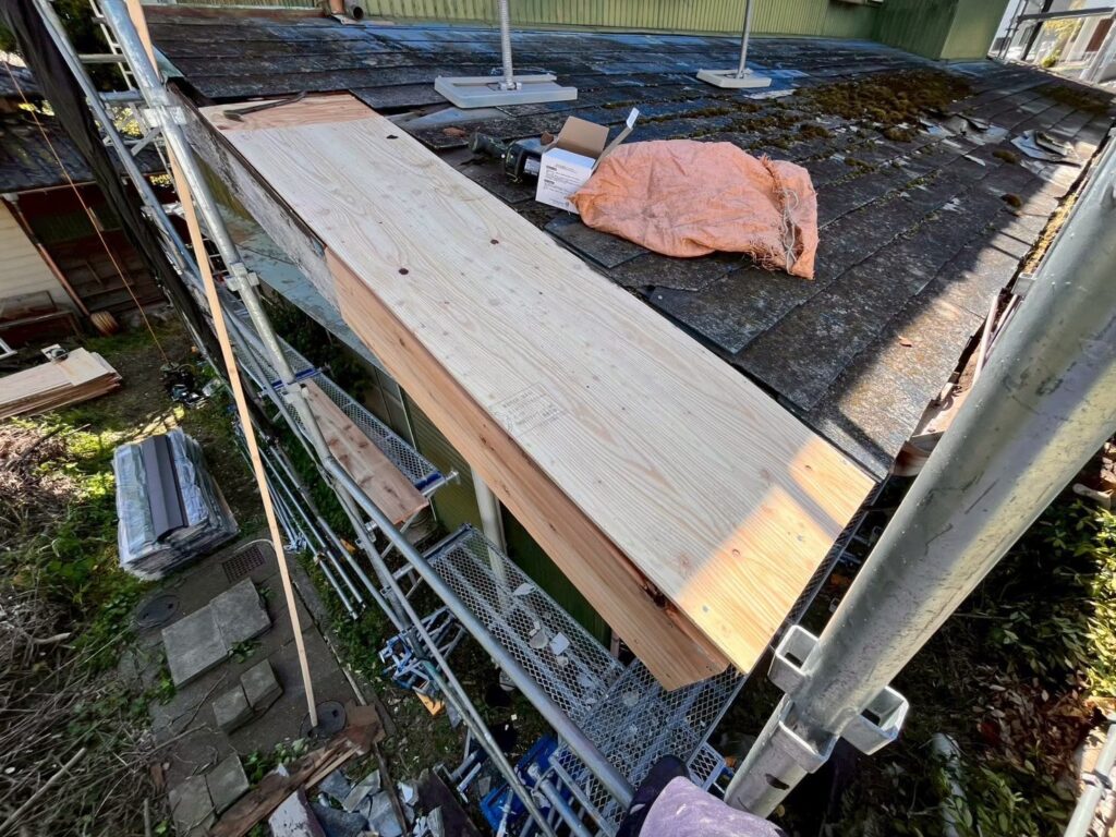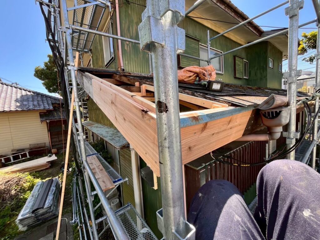 | 仮設足場設置 野地板まし張りカバー工法(大屋根・下屋根) 軒天張替え(一部) 破風板交換(一部) |