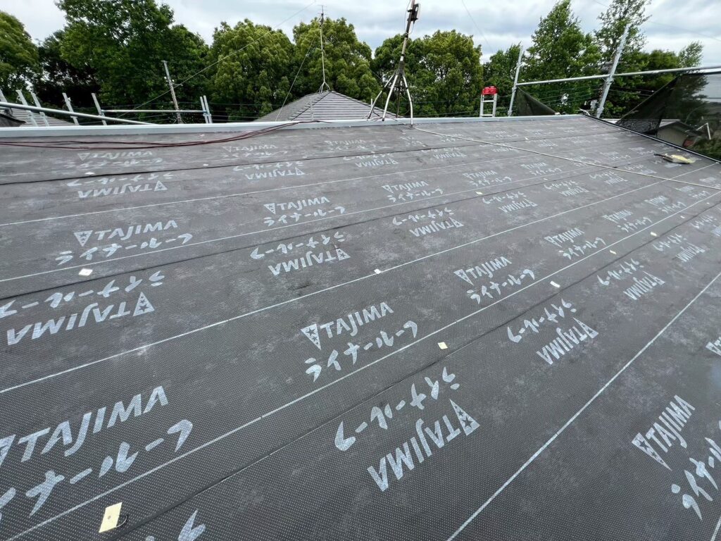 ニューライナールーフィングはノンアスベスト屋根材などの脆弱スレートのカバー工法に最適なルーフィングシートとなります。2次防水という役割でルーフィングがしっかりしていれば基本的に雨漏りしないです。風などで飛ばないようにしっかり貼って行きます。