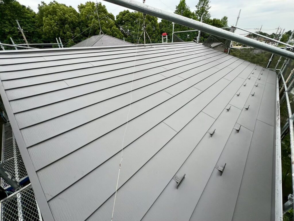 使用した屋根材はアイジー工業/スーパーガルテクトになります。スーパーガルテクトは塗膜15年、穴あき25年のメーカー保証が付いて、弊社からも施工保証が10年つきます! また、SGL鋼板製でサビにも強いです。