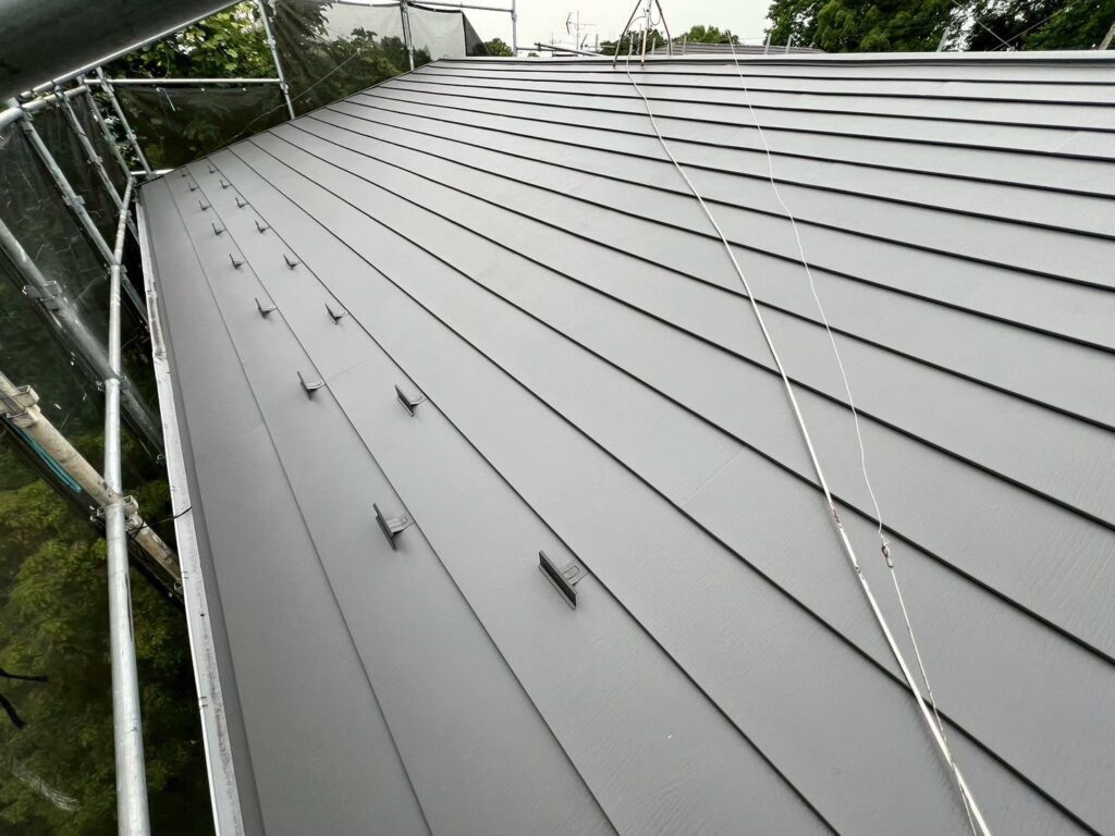 | ◯屋根カバー工法 屋根材:アイジー工業/スーパーガルテクト(色・シェイドチャコール) ルーフィング:田島ルーフィング/ニューライナールーフィング 貫板:ガルバリウム鋼板製 シーリング材:オートンイクシード |