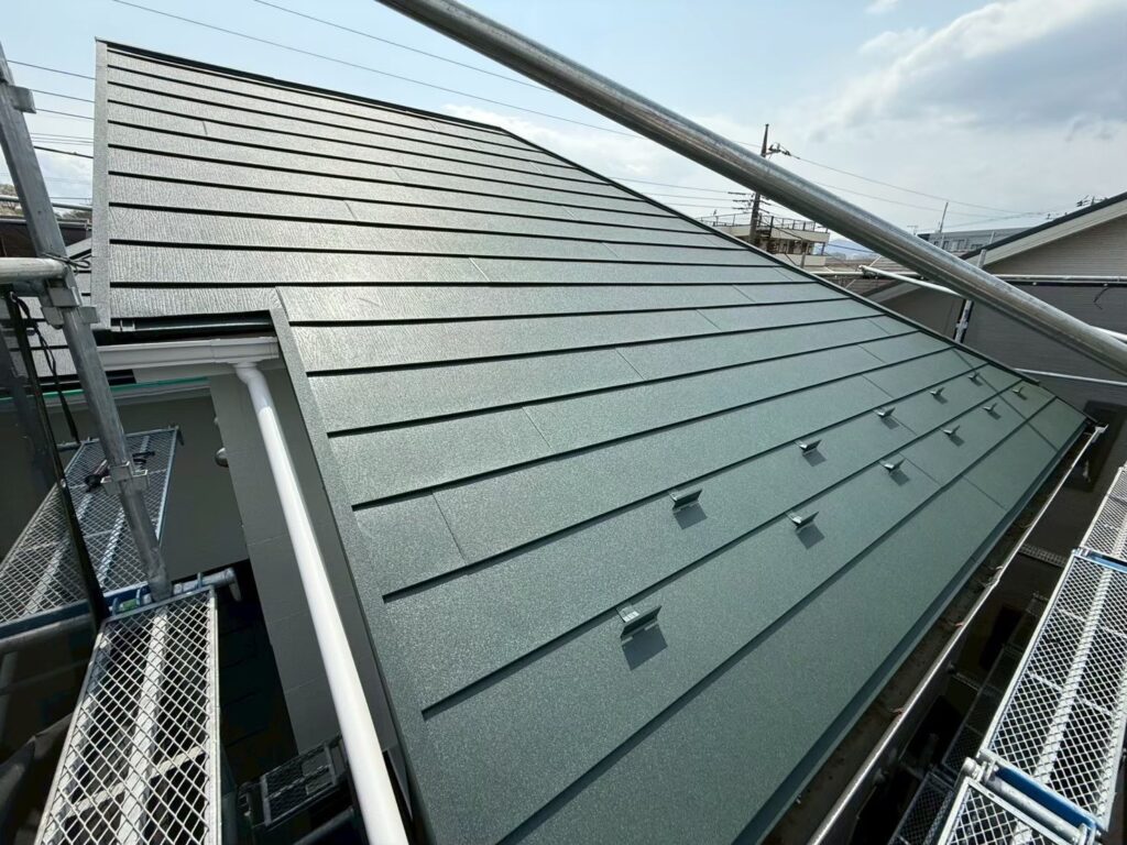 | ◯屋根カバー工法 屋根材:アイジー工業/スーパーガルテクト(色・シェイドモスグリーン) 貫板:ガルバリウム鋼板製 |