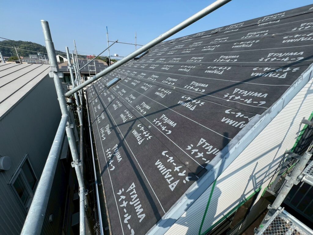 2次防水という役割でルーフィングがしっかりしていれば基本的に雨漏りしないです。風などで飛ばないようにしっかり貼って行きます。