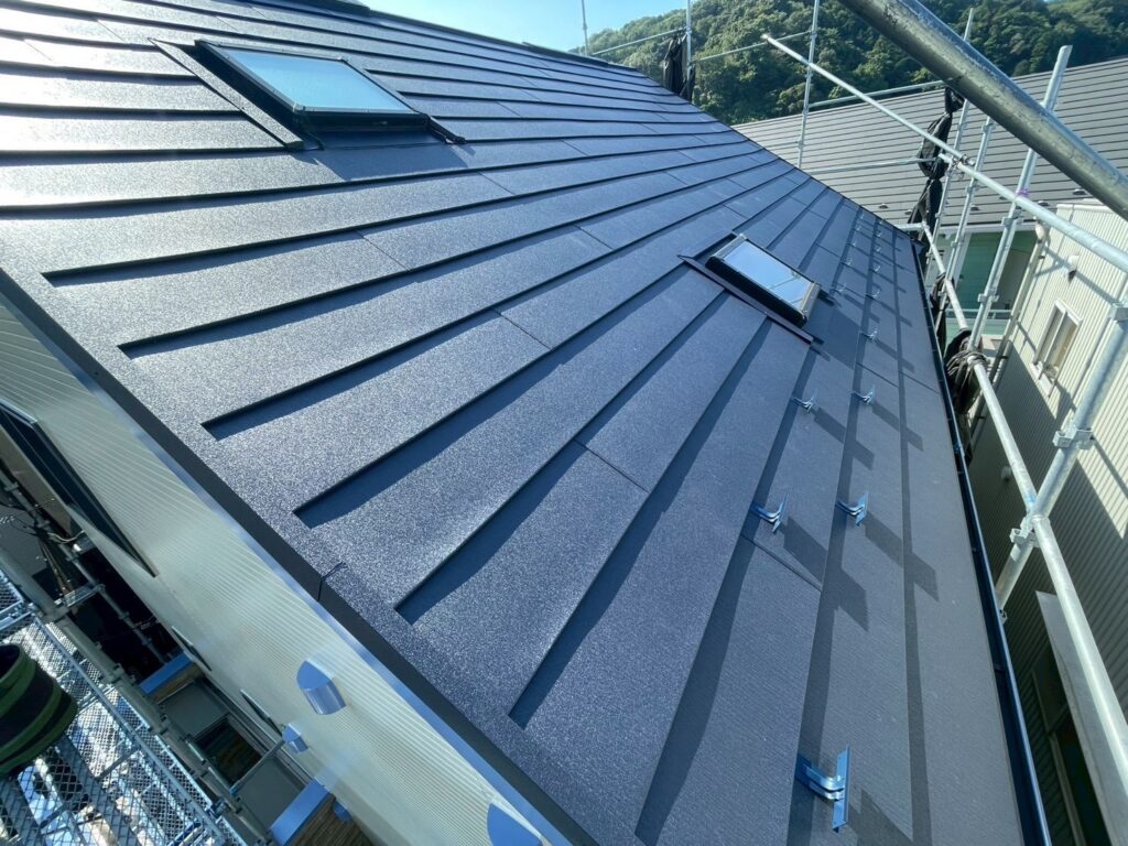 使用した屋根材はアイジー工業/スーパーガルテクトになります。スーパーガルテクトは塗膜15年、穴あき25年のメーカー保証が付いて、弊社からも施工保証が10年つきます! また、SGL鋼板製でサビにも強いです。