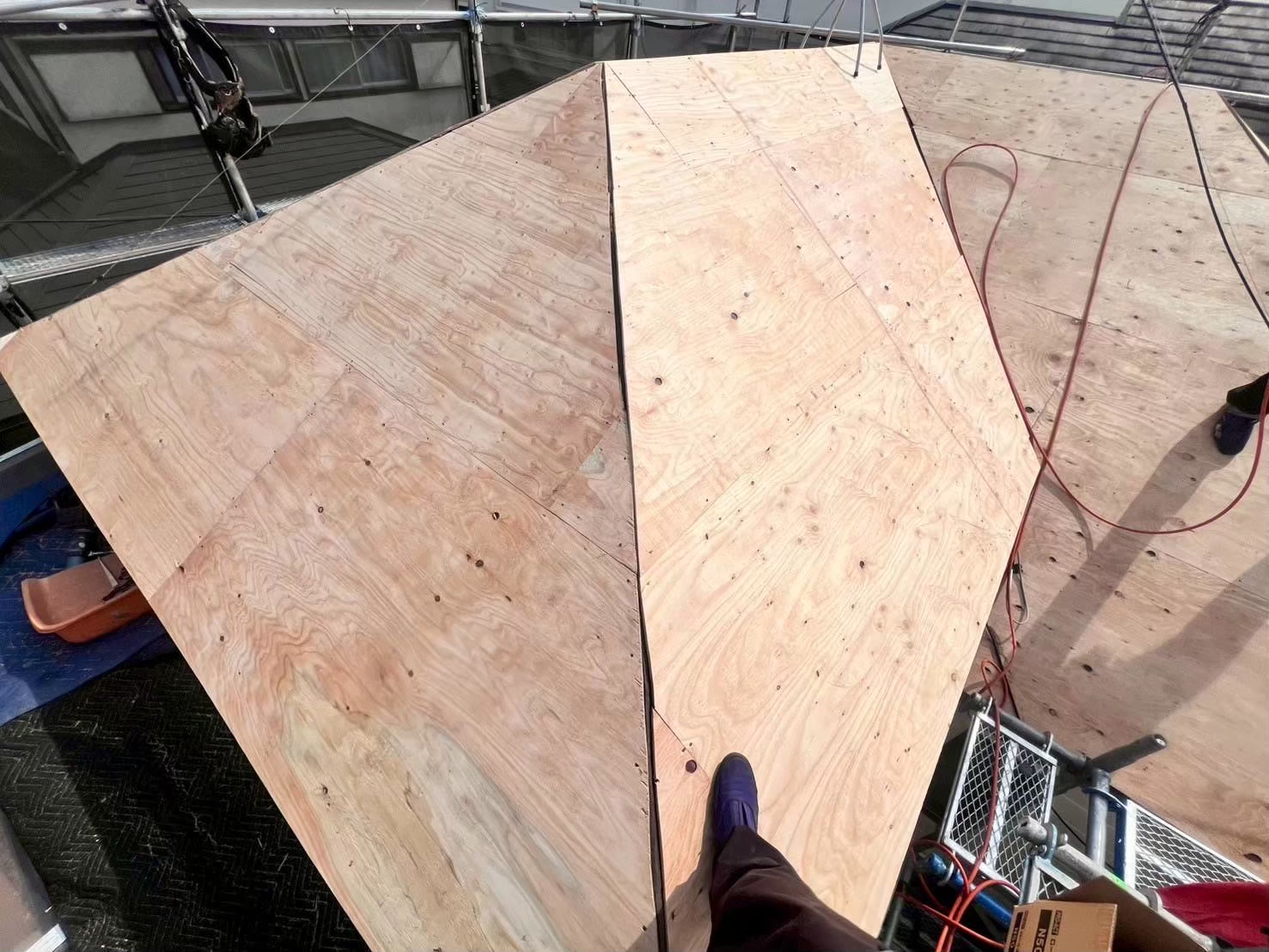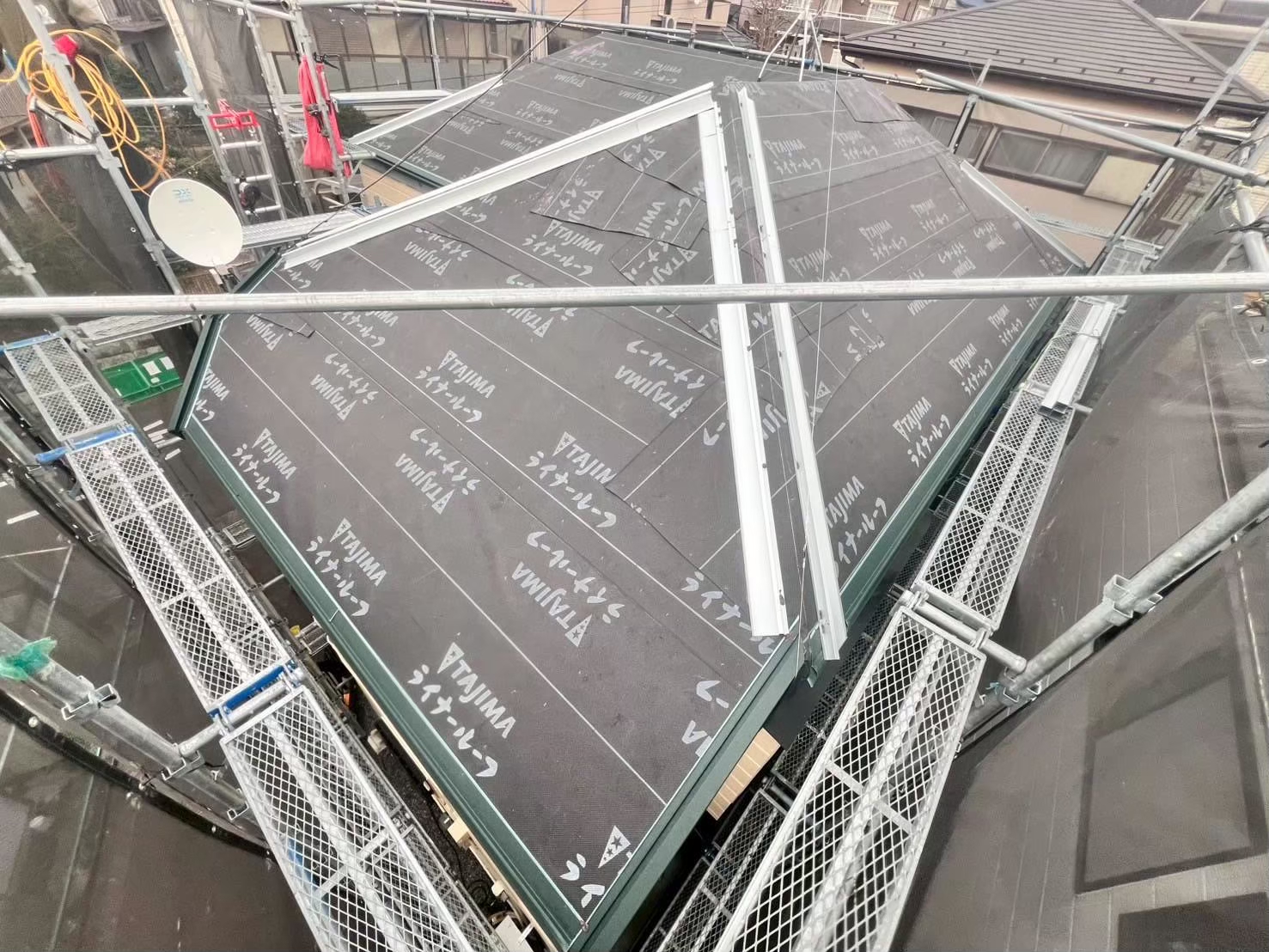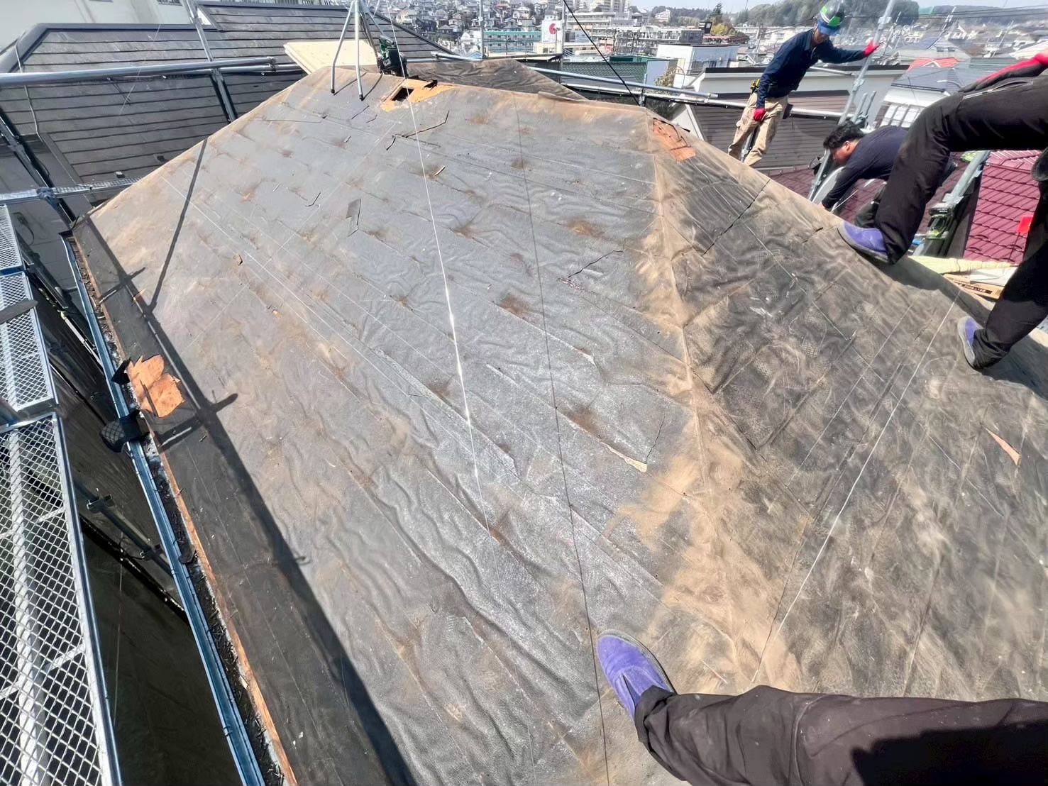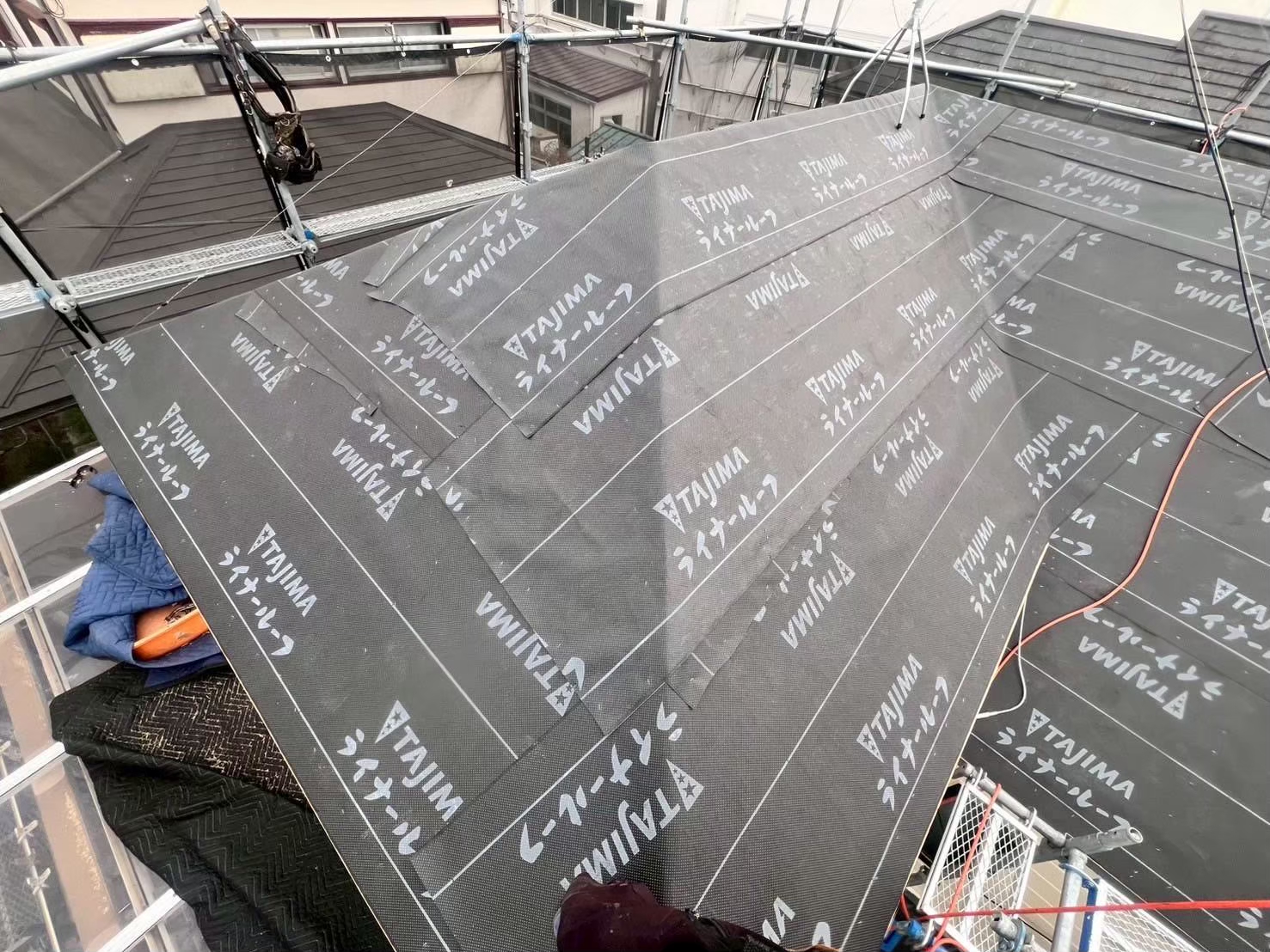 2次防水という役割でルーフィングがしっかりしていれば雨漏りしないです!飛ばないようにしっかり貼って行きます。