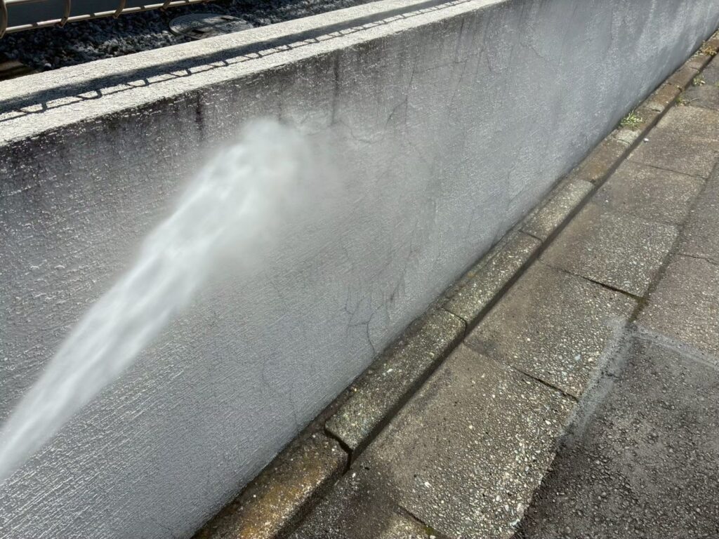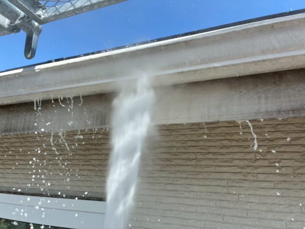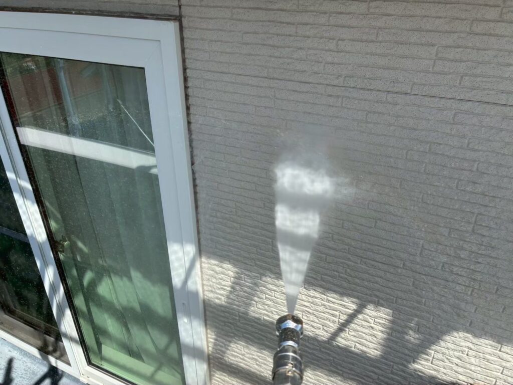 まず初めに、外壁の高圧洗浄により、汚れとコケをしっかり落とします! 汚れが残ってしまうと、塗料の密着性や耐久年数に影響しますので念入りに洗浄します。外構や土間や雨樋内もついでに洗浄します。今回はバイオ洗浄で行いました!