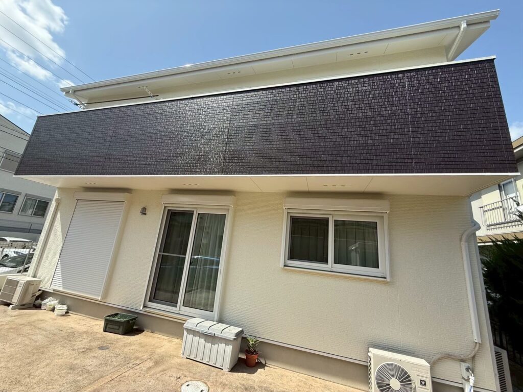 軒天と破風には、中塗り材と上塗り材にはエスケー化研/プレミアム無機マイルドを使用しました。