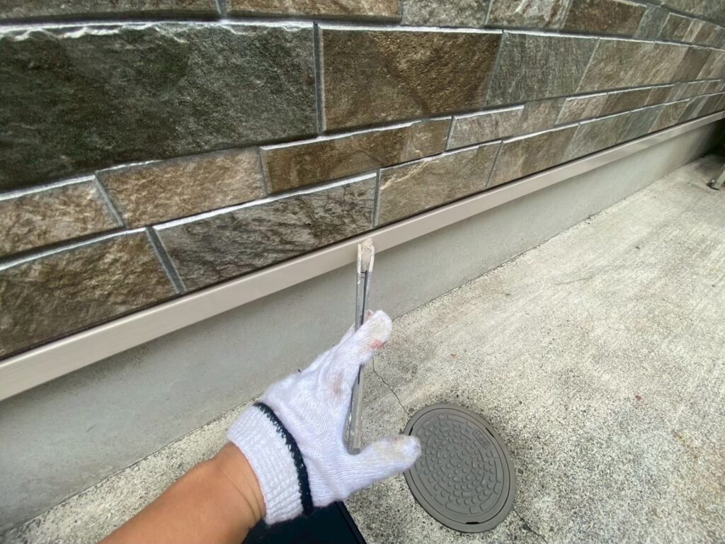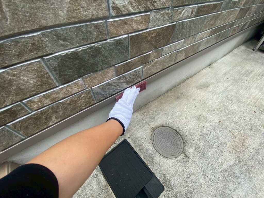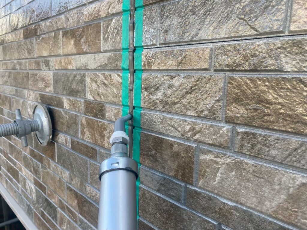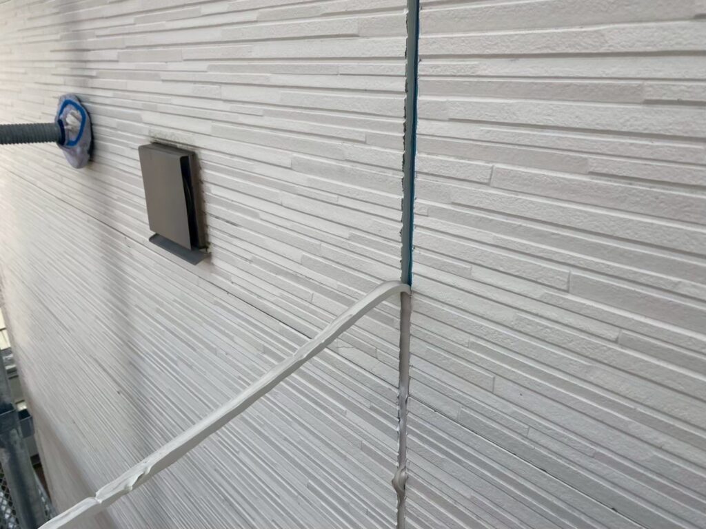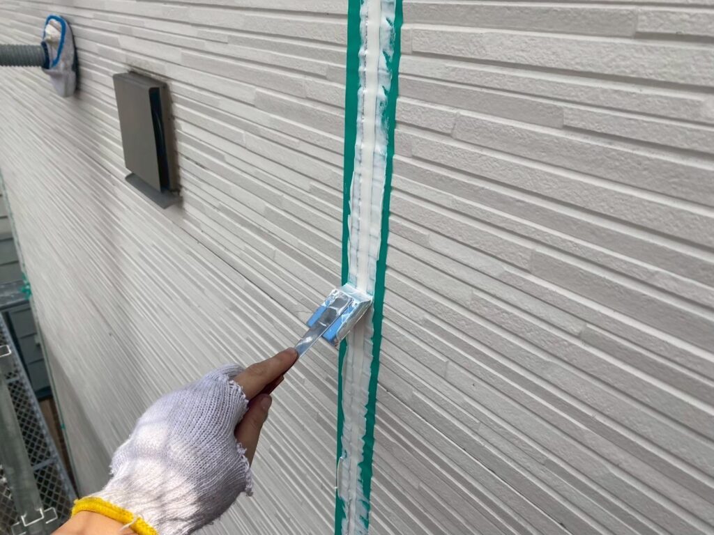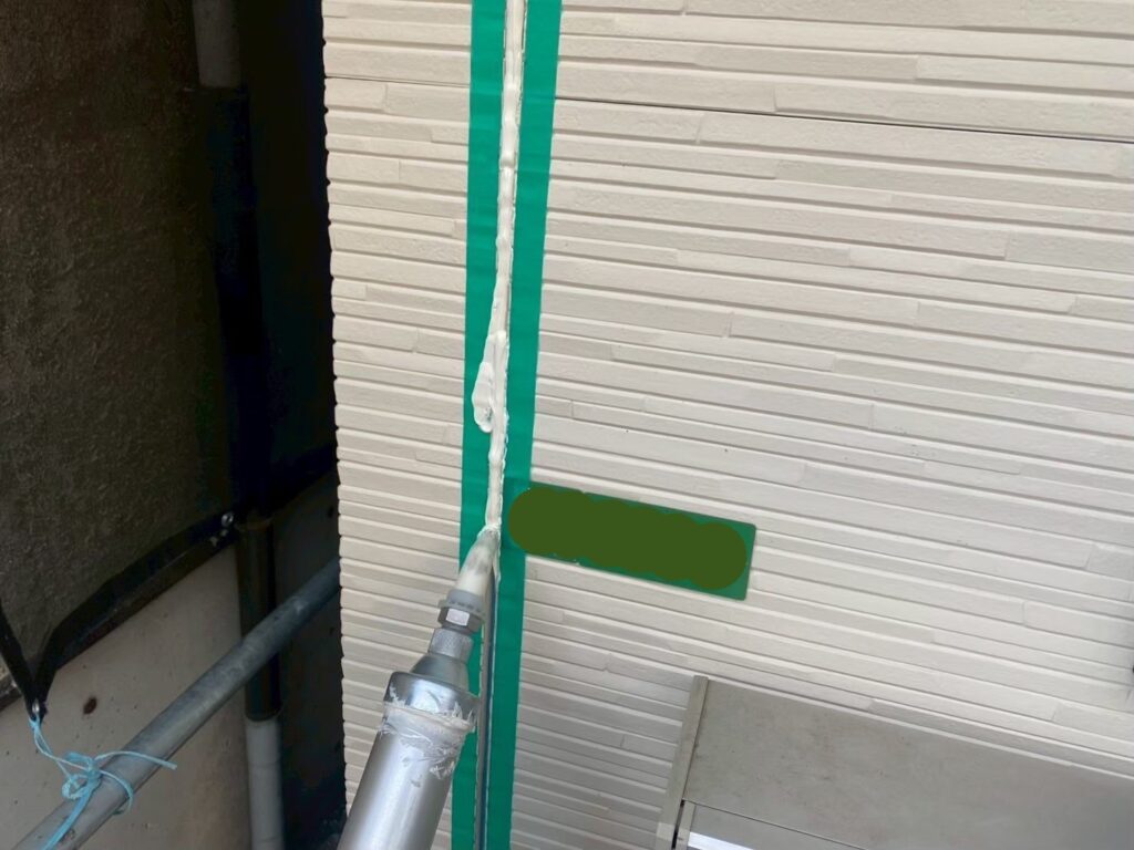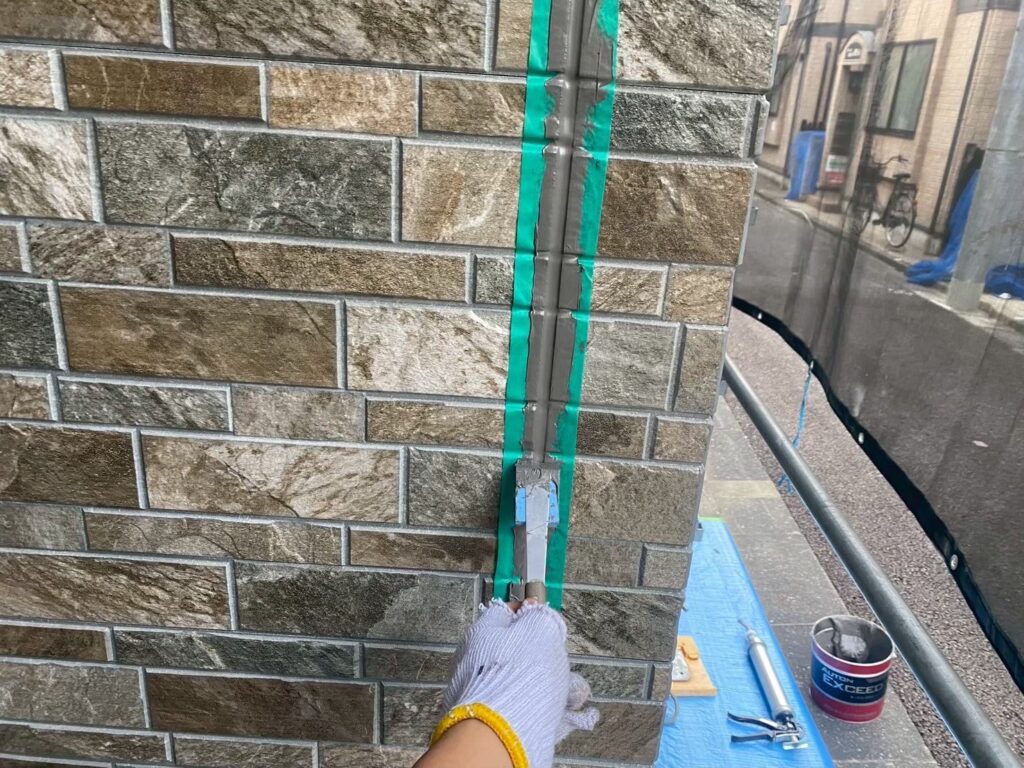 今回の工事で使用したコーキング材は、サンライズ/SRシールH100になります。耐久年数が約30年と超高耐久・超低汚染で、柔軟性があり、汚れがつきにくい材料になります。