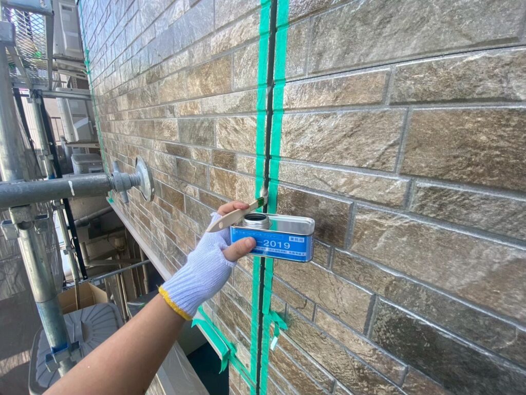 今回の工事で使用したコーキング材は、サンライズ/SRシールH100になります。耐久年数が約30年と超高耐久・超低汚染で、柔軟性があり、汚れがつきにくい材料になります。