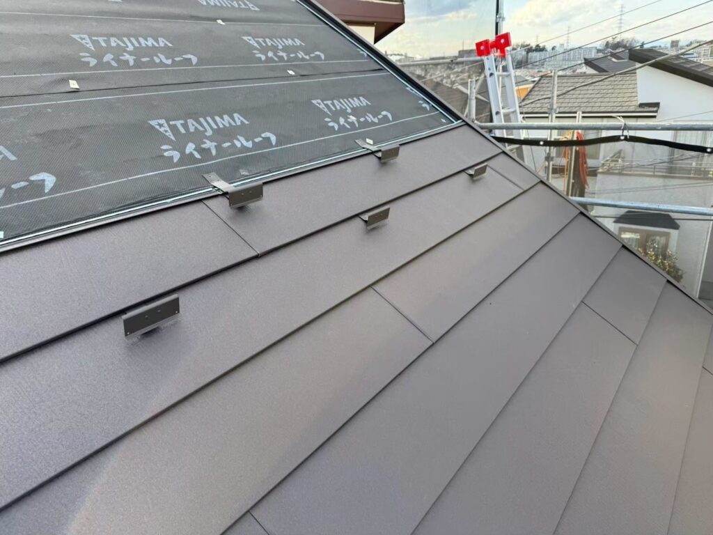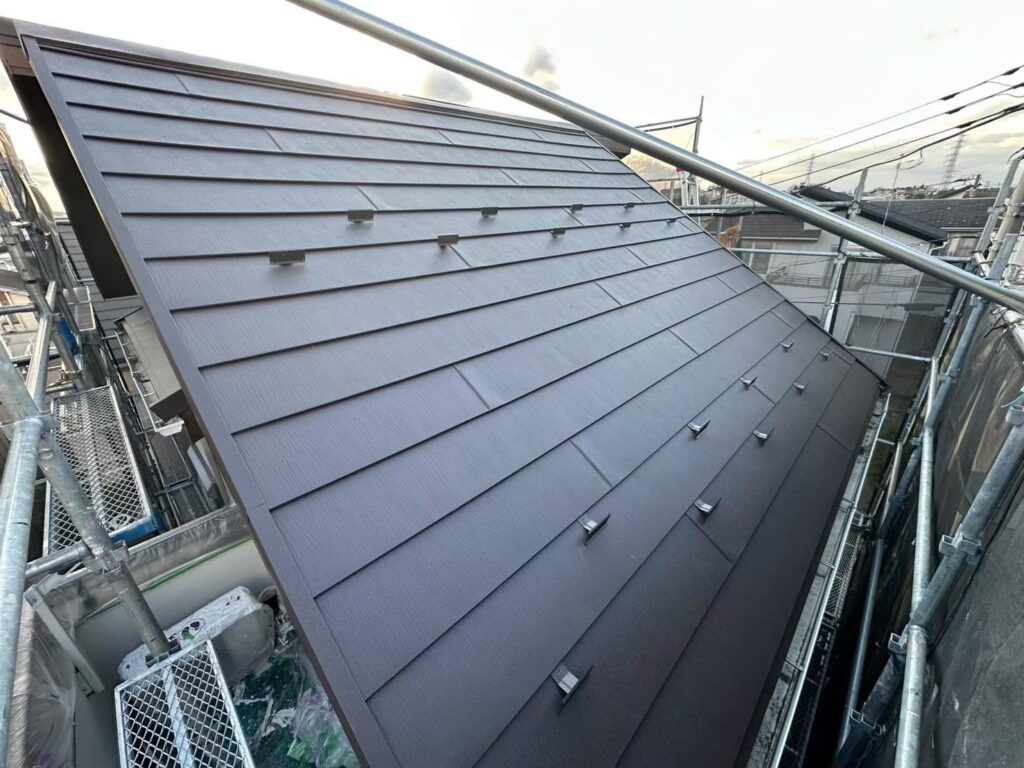 使用した屋根材はアイジー工業/スーパーガルテクトになります。スーパーガルテクトは塗膜15年穴あき25年のメーカー保証が付いて、弊社からも施工保証が10年つきます! また、SGL鋼板製でサビにも強いです。