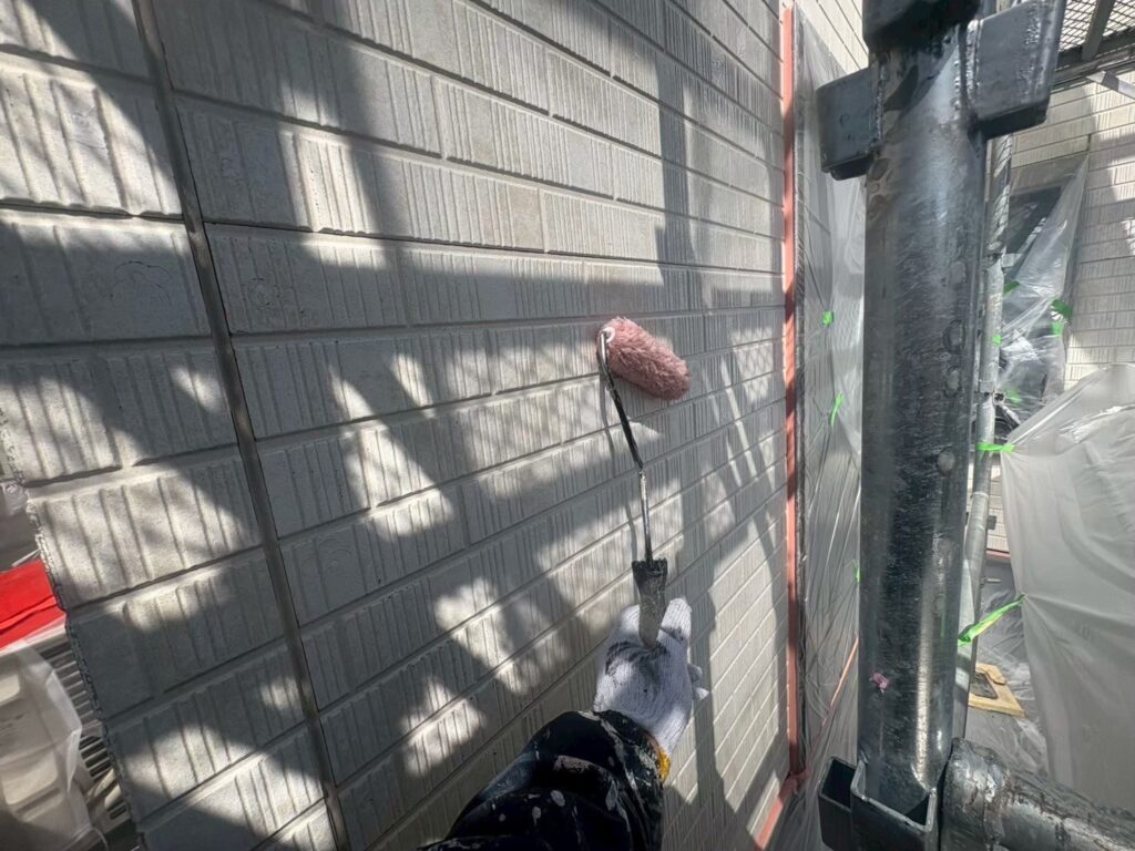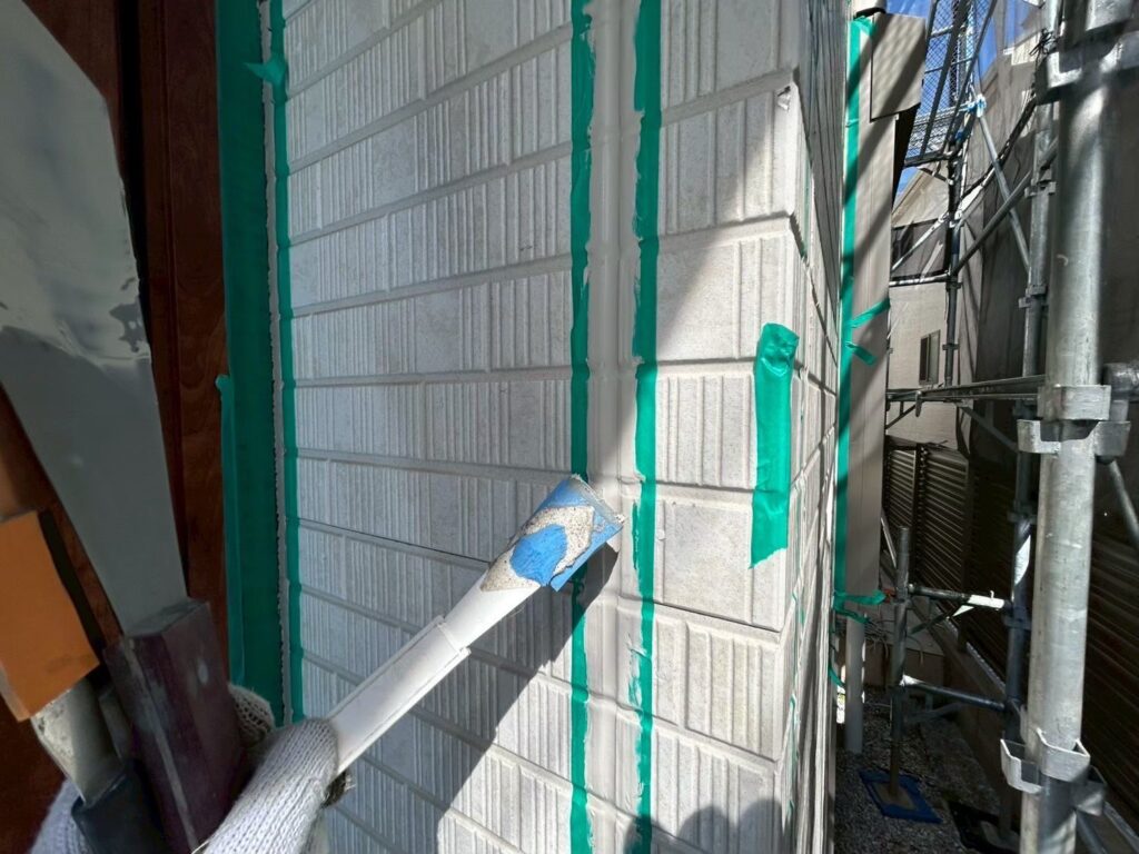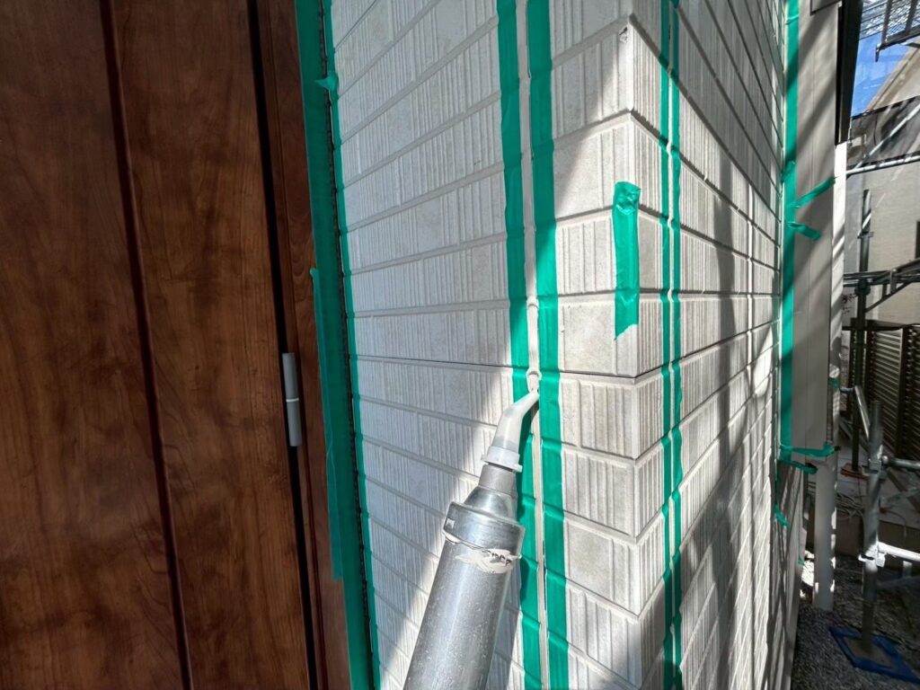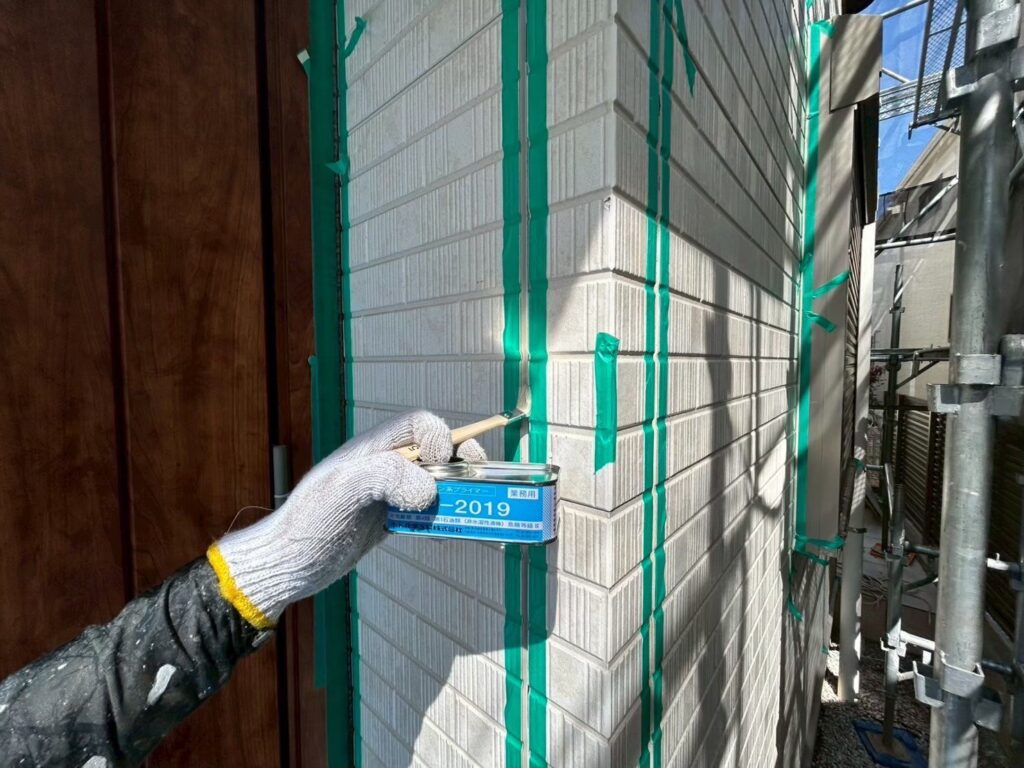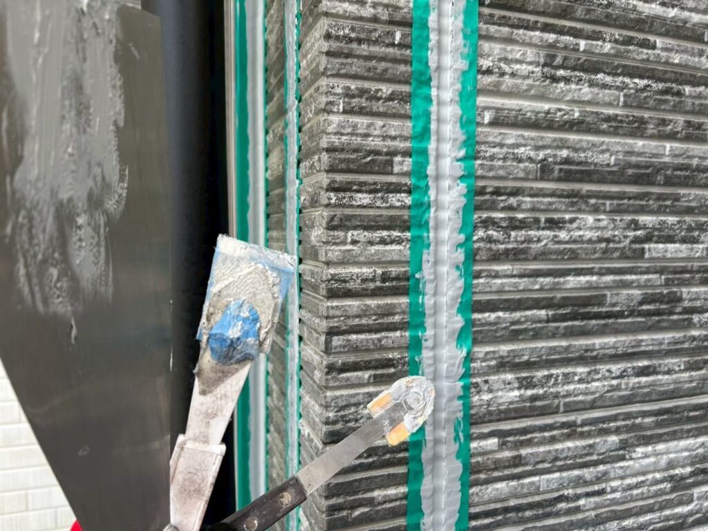 本来は、目地の打ち替え後に外壁塗装をするのですが、菊水化学工業/ロイヤルセラクリヤーは打ち替えた後の目地に塗布してはいけないため、塗装後に目地の打ち替えを行いました。材料により工程が変わり、知識が必要になります!
