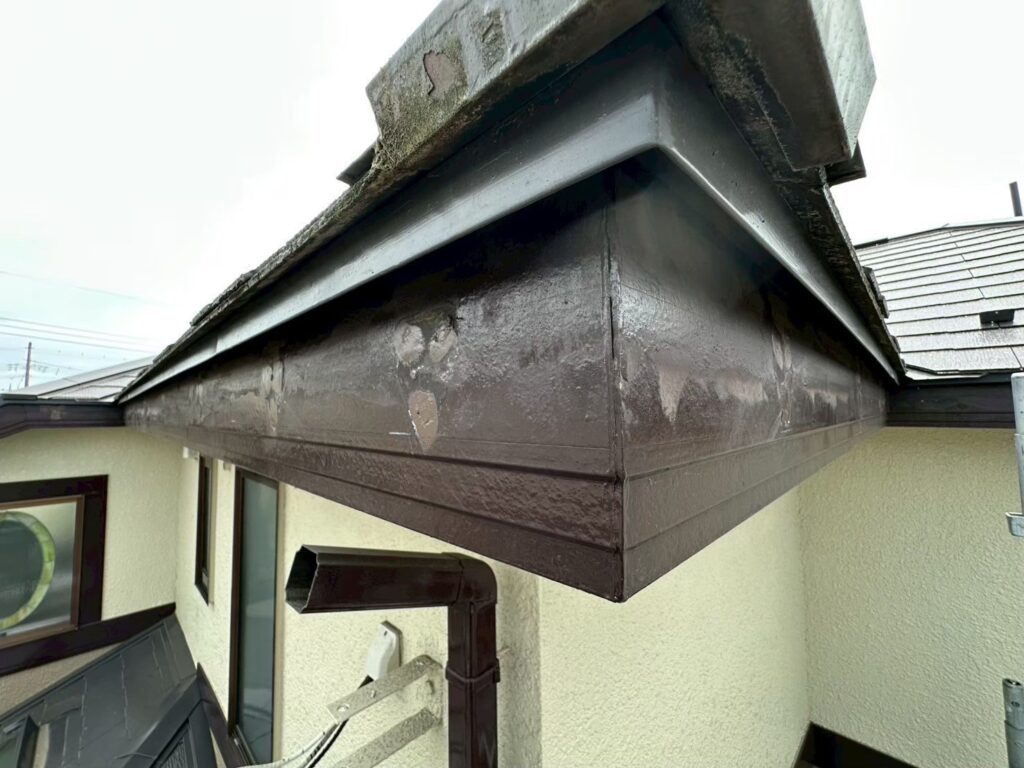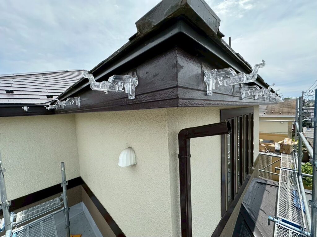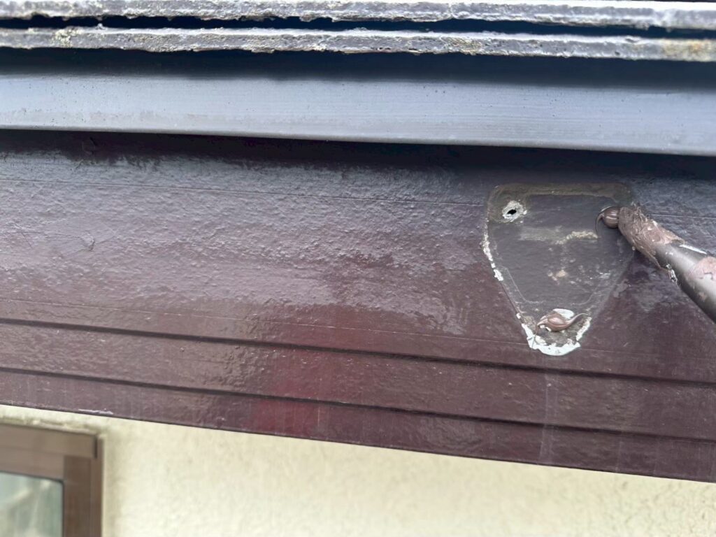 注意点は、鼻隠し(軒受け金具がついていた箇所)や建物の歪みにより金具で勾配をつけても逆流することがあります。水平器を鼻隠しに当てて勾配を確認してから金具をつけて行く事が重要です!