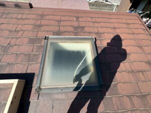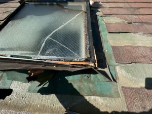 | 天窓ガラスが割れてしまった為、天窓の交換のご依頼を頂きました。 天窓交換に伴い、周りの屋根材の差し替えも行わせていただきました。 |