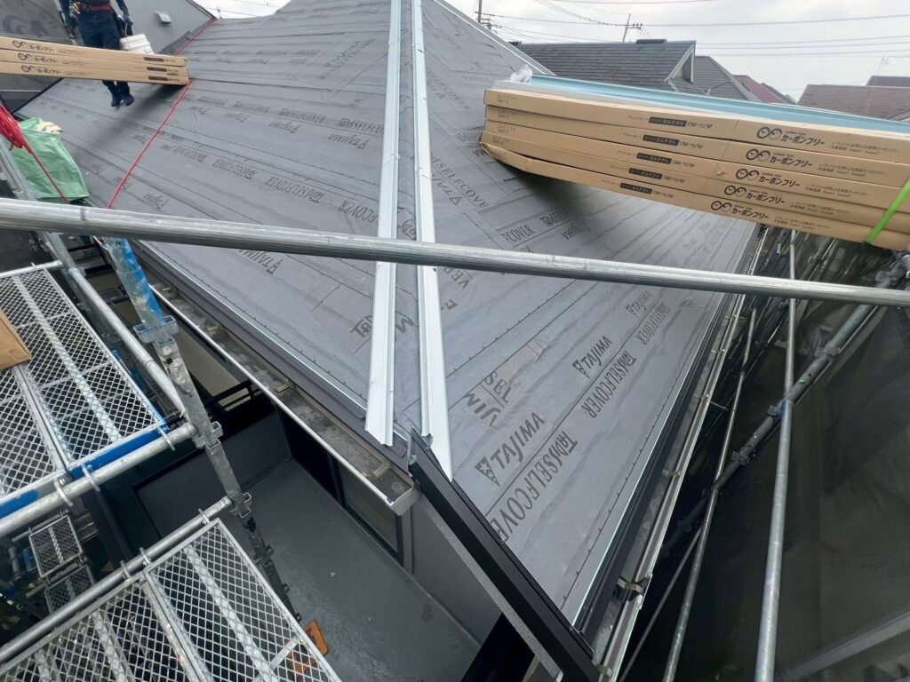 棟際まで葺き上がったら貫板という棟板金を固定するために必要な材料を設置します。弊社で取り扱っている貫板には杉・樹脂・ガルバリウム鋼板製と3種類がありまして、今回は高耐久性をお客様がご希望されていましたのでガルバリウム製の棟下地を使用しました。