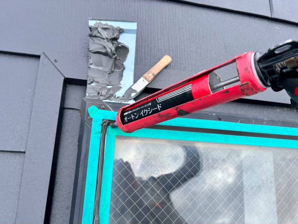 継目の内側にシーリングをしっかり打っていきます。今回、使用したシーリング材は、オート化学工業のオートンイクシードです。オートンイクシードは、耐久年数が約30年と、超高耐久のシーリング材になります。ウレタン系やシリコン系の3倍近い耐久性が期待できます!
