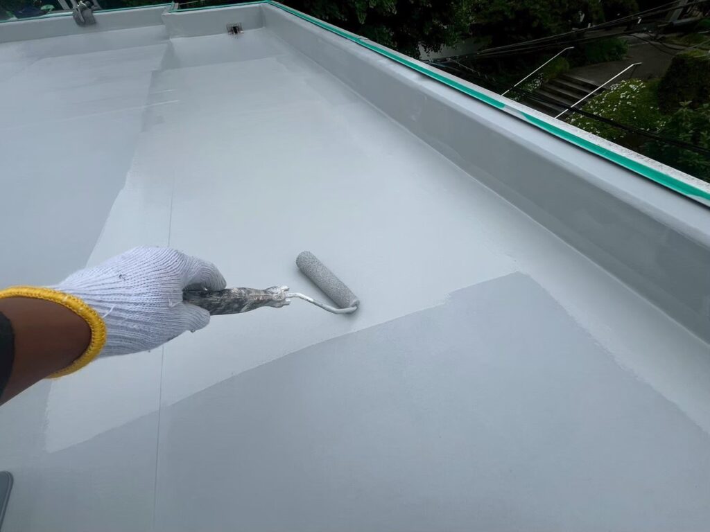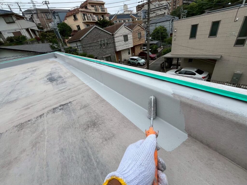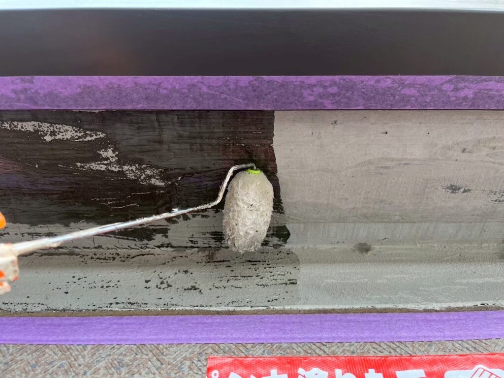 次に、立ち上がり部分にウレタン防水材を塗っていきます。防水材は厚みがないと防水効果があまり得られないので、厚みをつけるために二度塗りします!