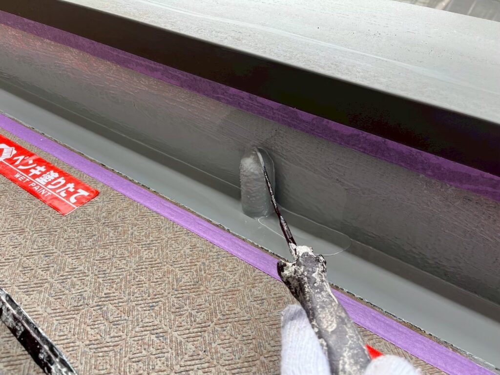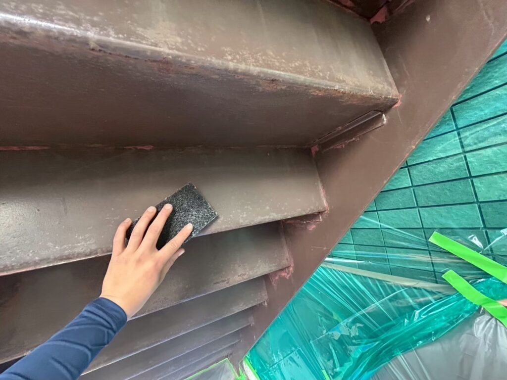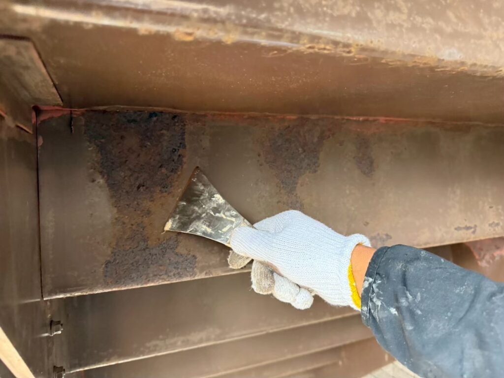 高圧洗浄が終わったら、タキロンマテックス/タキシールで長尺シート端部シーリング工事を行い、塗装範囲の劣化状況を見ながら、ヘラやケレンなどを使って下地調整を行います。錆も落とします!