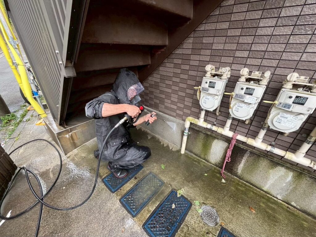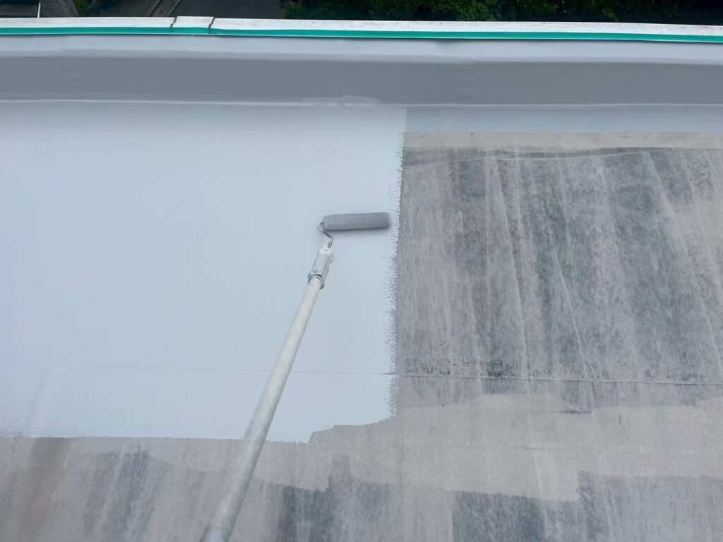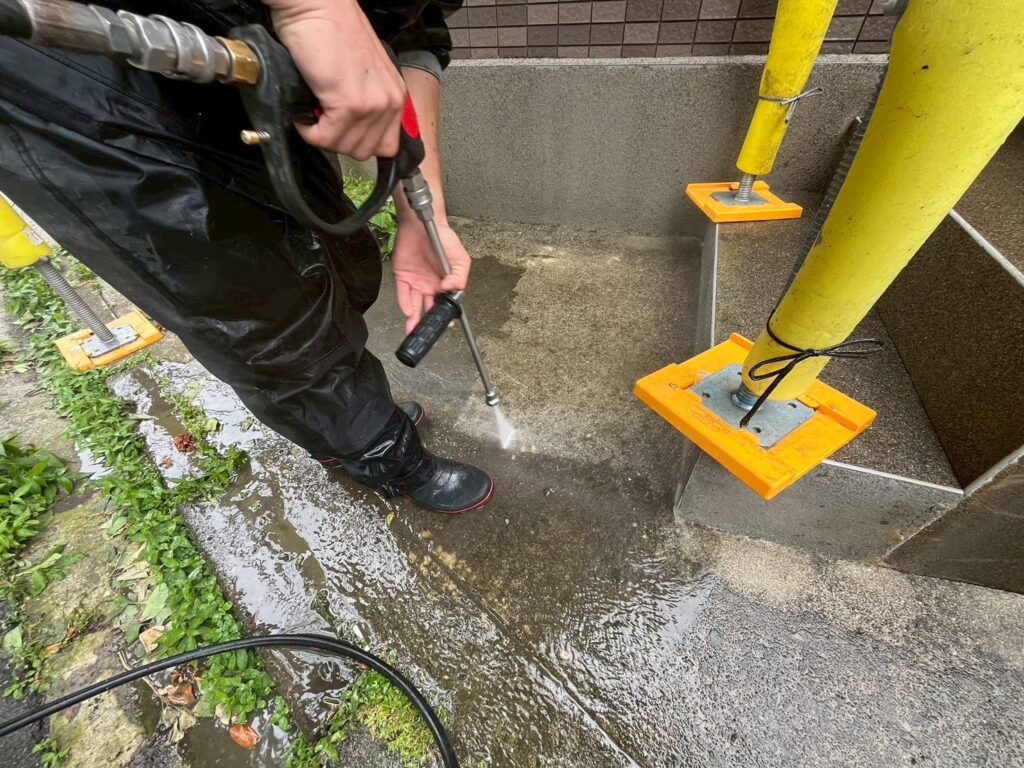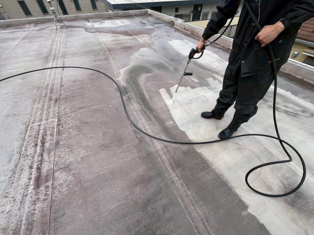 まず初めに、高圧洗浄できれいにしていきます! 汚れの上に塗布してもすぐ剥がれてしまうため、汚れを洗浄し密着性をよくします。強すぎる圧力は既存の防水層を痛めてしまうので、慎重に洗浄していきます!